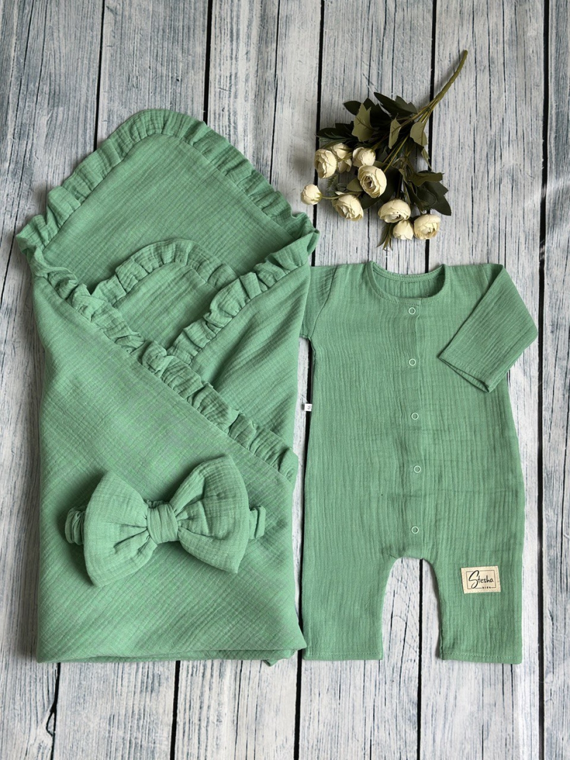 Теги: Купить детские конверты, комбинезон оптом, детские конверты на выписку оптом. 335-ОЛ. Комплект из детского комбинезона, р 56 и конверта муслин, хлопок 100% 90/90 см, олива цена,отзывы официальный сайт "Стеша Керчь"